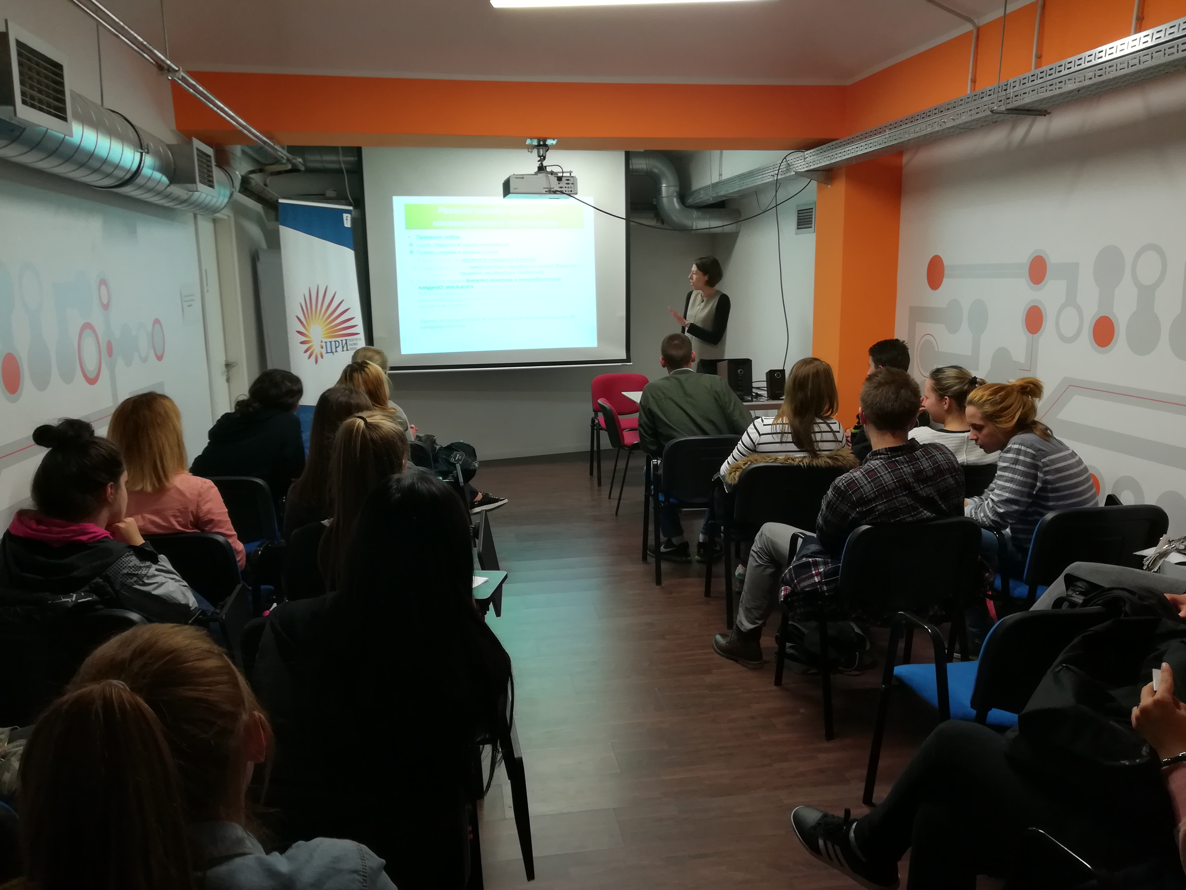 Prvo predavanje održano je 26. septembra u In Centru na kojem su izlagale članice Centra za razvoj ideja Ena Dugonjić i Jovana Skrinjik. Ena Dugonjić je sa đacima diskutovala o osnovama preduzetništva, navodili su se primeri uspešnih ljudi iz Srbije i sveta. Enino motivaciono predavanje, Jovana Skrinjik je iskoristila kao priliku da učenike ukratko uvede u svet organske proizvodnje i pripremi za rad koji ih čeka u naredna dva meseca. Govorila je o tome šta je organska proizvodnja, o razlikama između konvencionalne i organske proizvodnje, zdravstvenim aspektima i perspektivama u Srbiji, kao i o sertifikaciji kao veoma bitnom segmentu. Učenici su već nakon prvog predavanja pokazali zainteresovanost i spremnost da budu deo pobedničkog tima kroz brojne ideje o svojim budućim preduzetničkim poduhvatima!